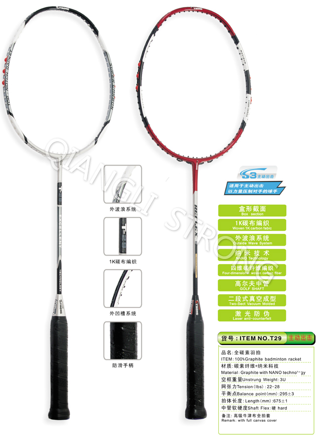 品名:T29全碳素羽拍 ITEM:100%Graphite badminton racket 材质:碳素纤维+纳米科技 Material:Graphite with NANO technology 空框重量Unstrung Weight:3U(85-89g) 网张力Tension(lbs):22-28 平衡点Balance point(mm):295+/-3 拍体长度:Length(mm):675+/-1 中管软硬度Shaft Flex:硬 hard 备注:高级牛津布全拍套 Remark:with full canvas cover |