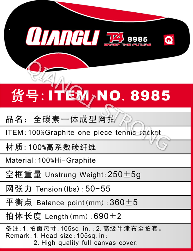货号:ITEM NO.8985 品名:全碳素一体成型网拍 ITEM:100% Graphite one piece tennis racket 材质:100%高系数碳纤维 Material:100%Hi-Graphite 空框重量Unstrung Weight:250+/-5g 网张力Tension(lbs):50-55 平衡点Balance point(mm):360+/-5 拍体长度 Length(mm):690+/-2 备注:1.拍面尺寸:105sq.in.;2.高级牛津布全拍套。 Remark:1.Head size:105sq.in; 2.High quality full canvas cover. |