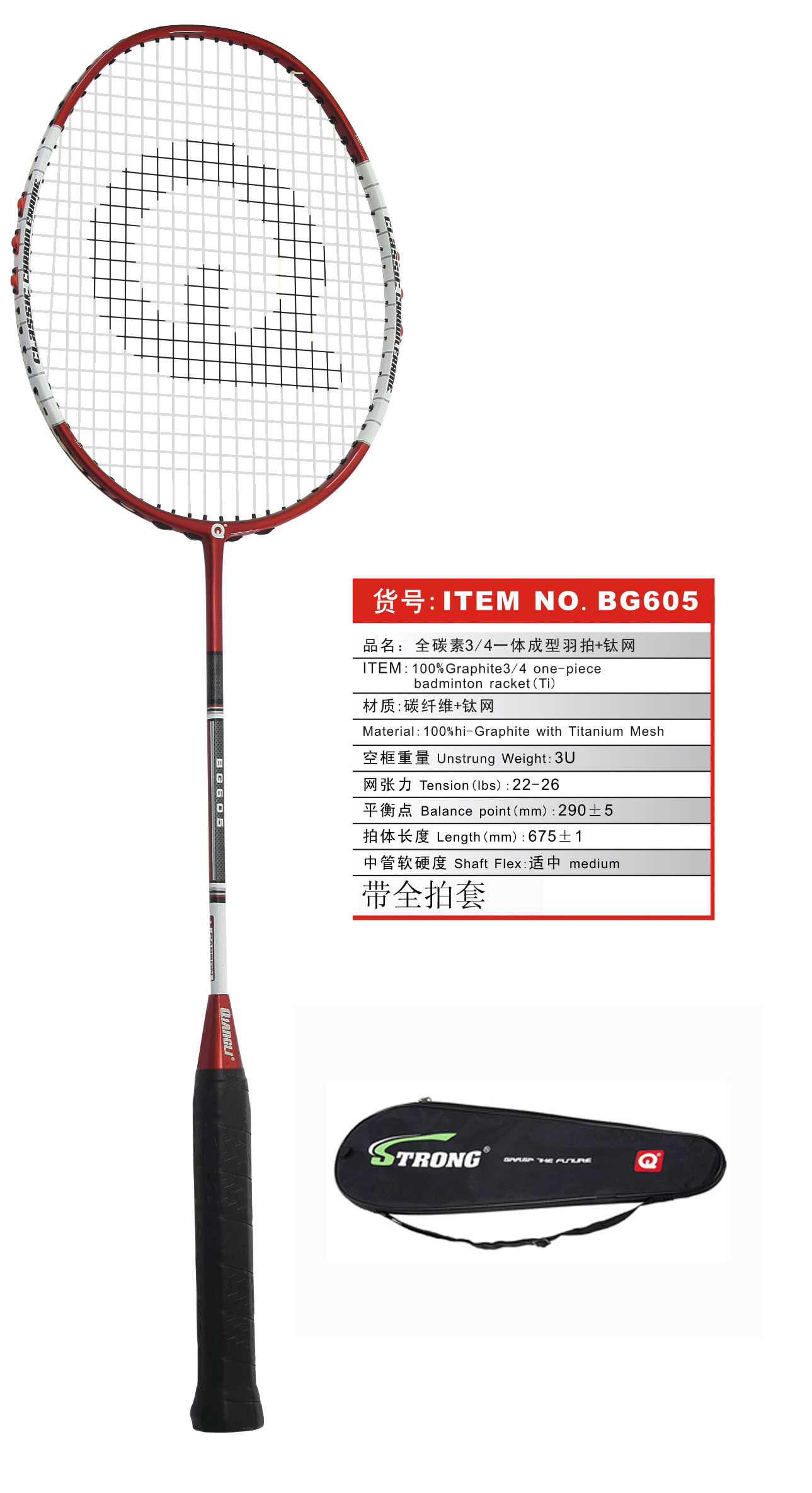 | 货号:ITEM NO.BG605 品名:全碳素3/4一体成型羽拍+钛网 ITEM:100% Graphite 3/4 one-piece badminton racket(Ti) 材质:碳纤维+钛网 Material:100%hi-Graphite with Titanium Mesh 空框重量Unstrung Weight: 3U(85-89g) 网张力Tension(lbs):22-26 平衡点Balance point(mm):290+/-5 拍体长度Length(mm):675+/-1 中管软硬度Shaft Flex:适中 medium 备注:带牛津布全拍套 Remark:with full canvas cover |