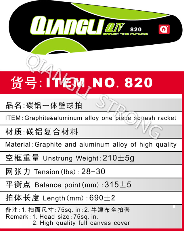 货号:item NO.820 品名:碳铝一体壁球拍 item:graphite&aluminum alloy one piece squash racket 材质:碳铝复合材料 material:graphite and aluminum alloy of high quality 空框重量Unstrung weight:210+/-5g 网张力tension(lbs):28-30 平衡点balance point(mm):315+/-5 拍体长度length(mm):690+/-2 备注:1.拍面尺寸:75sq.in.;2.牛津布全拍套 remark:1.head size 75sq.in.; 2.high quality full canvas cover |