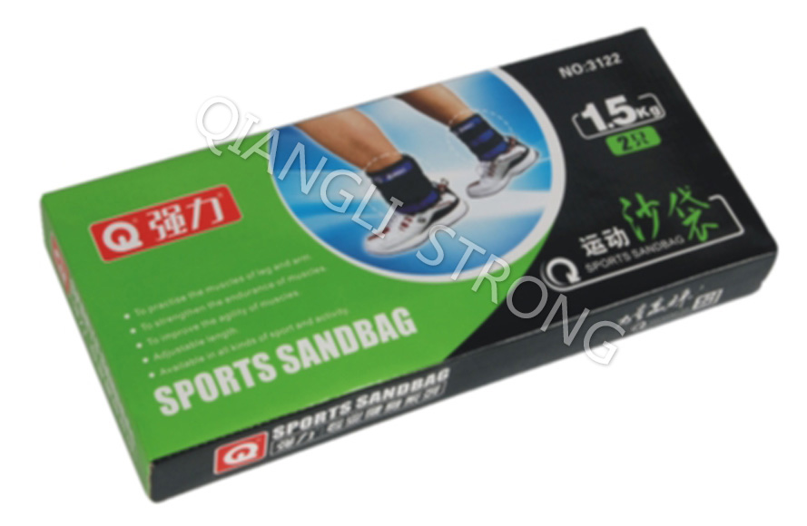 货号:ITEM NO.3122品名:运动沙袋(2只X1.5公斤)ITEM:sports sandbag 材质:100%铁砂+尼龙布Material:iron sand+nylon重量weight:1.5kgX2pcs备注:彩盒2只装9盒/箱remark:2pcs with color box,9pairs/ctn