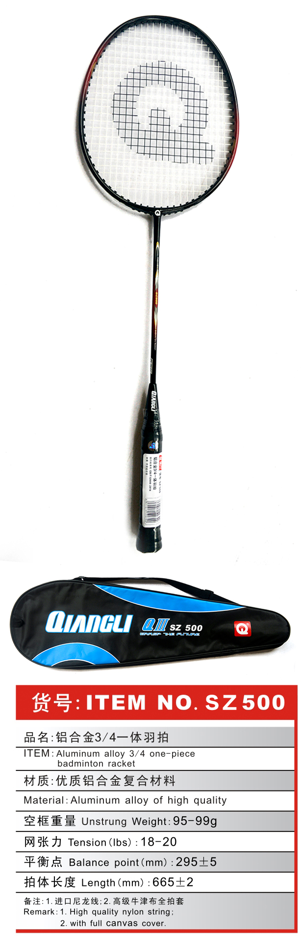 | 货号:ITEM NO.SZ500 品名:铝合金3/4一体羽拍 "ITEM:Aluminum alloy 3/4 one-piece badminton racket" 材质:优质铝合金复合材料 Material:Aluminum alloy of high quality 空框重量Unstrung Weight:90-94g 网张力Tension(lbs):18-20 平衡点Balance point(mm):295+/-5 拍体长度Length(mm):665+/-2 "备注:1.进口高级尼龙弦线;2.进口高级PVC柄皮;3.高级牛津布全拍套 Remark:1.High quality nylon string;2.high quality PVC grip; 3.with full canvas cover." |
